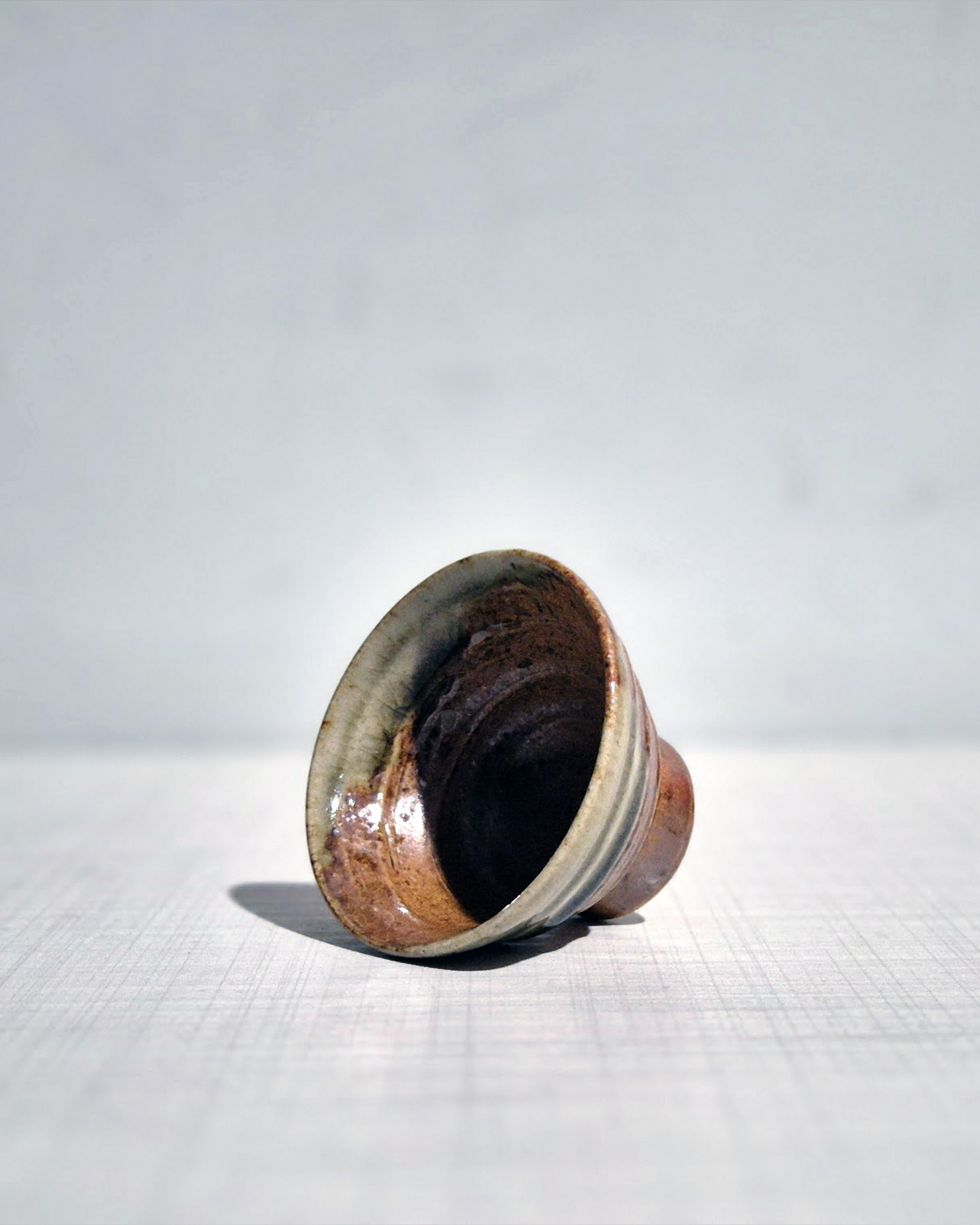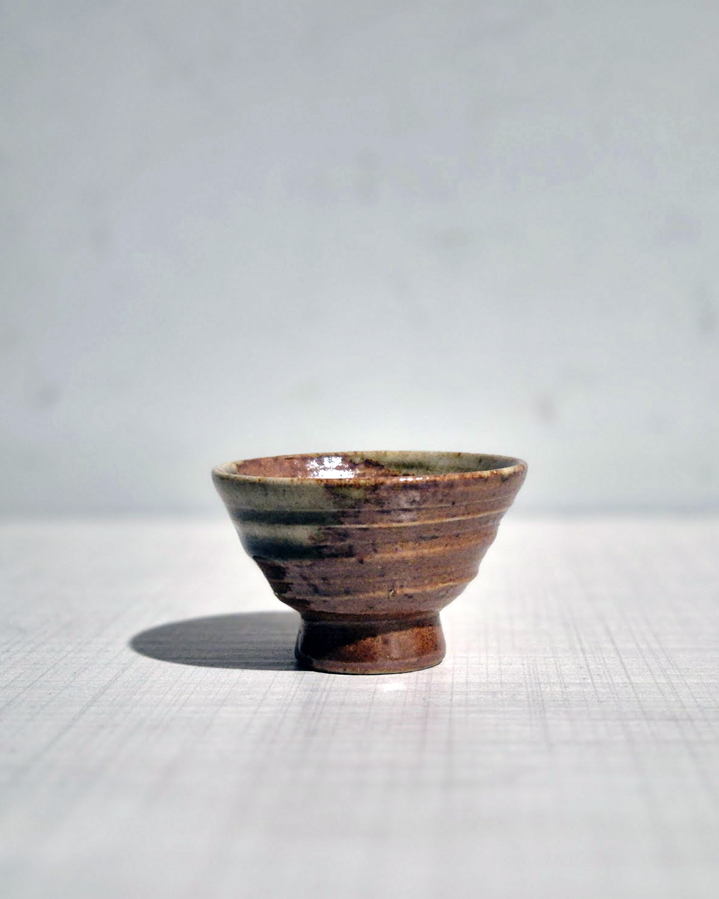 This small sake cup (guinomi) is made from iron-rich clay and finished with a natural ash-toned glaze that developed during firing. The surface shows warm brown tones with subtle greenish glaze near the rim, while the body retains visible throwing lines from the potter’s wheel, giving the piece a strong handmade character. The slightly flared shape allows aromas to open when drinking sake, and the compact foot provides a stable base in the hand. On the side near the foot there is a small carved signature mark, indicating it is a studio-made piece by an individual potter rather than factory production. Works with this earthy firing style and simple form are commonly associated with Japanese studio pottery from around the 1980s–2010s, reflecting the aesthetic of everyday sake vessels used in Japanese dining culture.