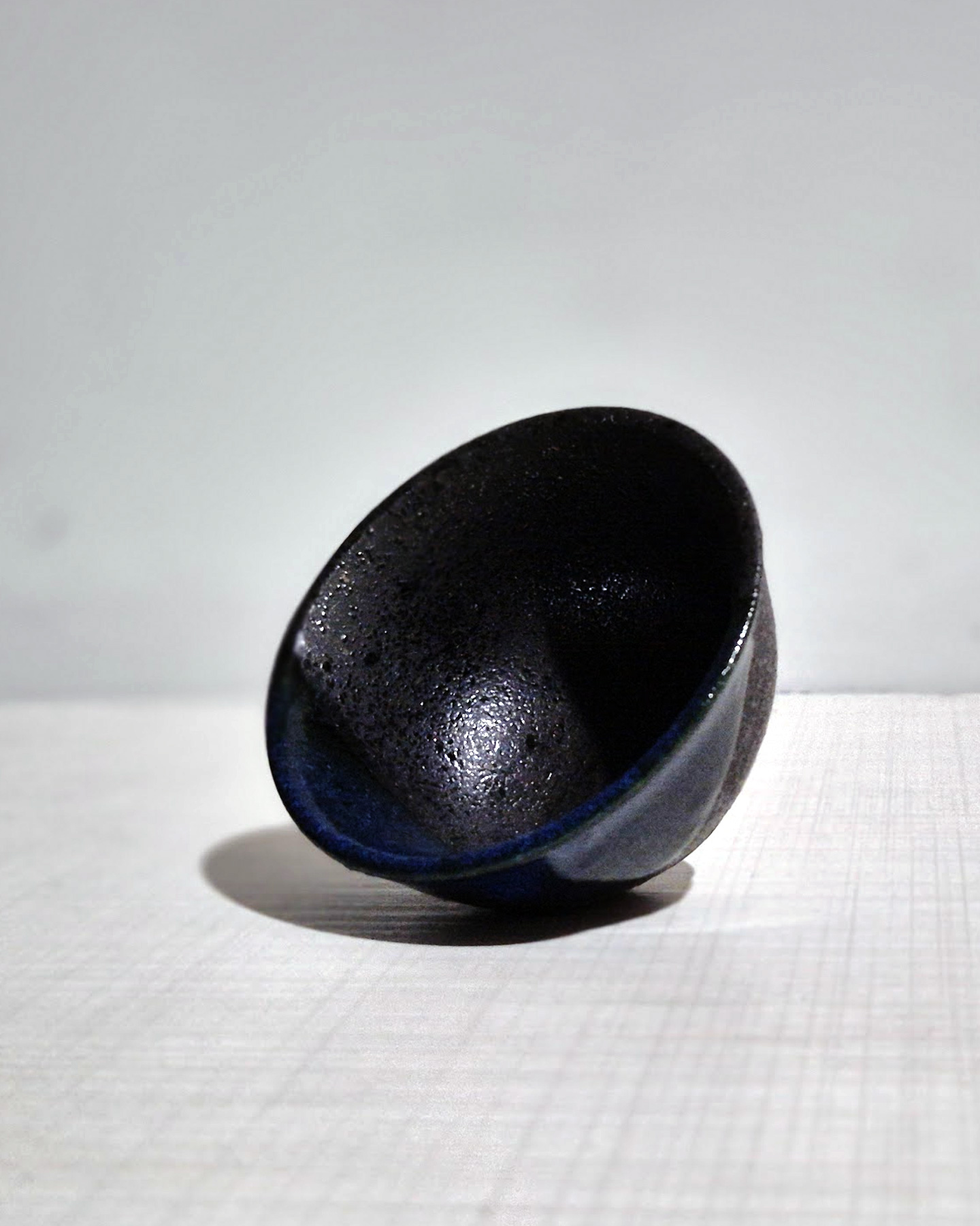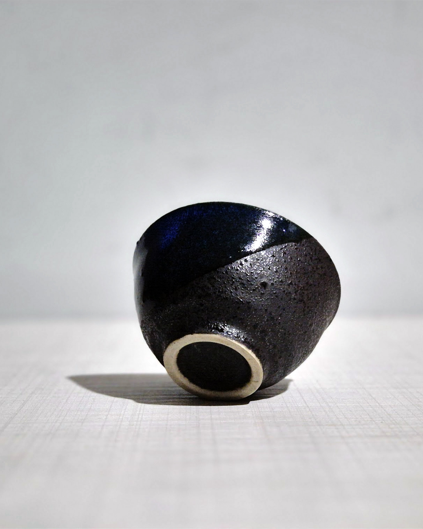 This sake cup (guinomi) features a deep black glaze with subtle blue tones that appear depending on the light. Natural kiln effects created during firing give the surface a unique texture and color variation. The slightly rough clay body provides a comfortable grip, and the gently open rim helps release the aroma of sake. Pieces with this style are commonly seen in modern Japanese studio pottery from around the 1990s–2010s. The cup measures approximately 6–7 cm in diameter and 4–5 cm in height, representing the quiet and minimalist beauty of contemporary Japanese sake ware.